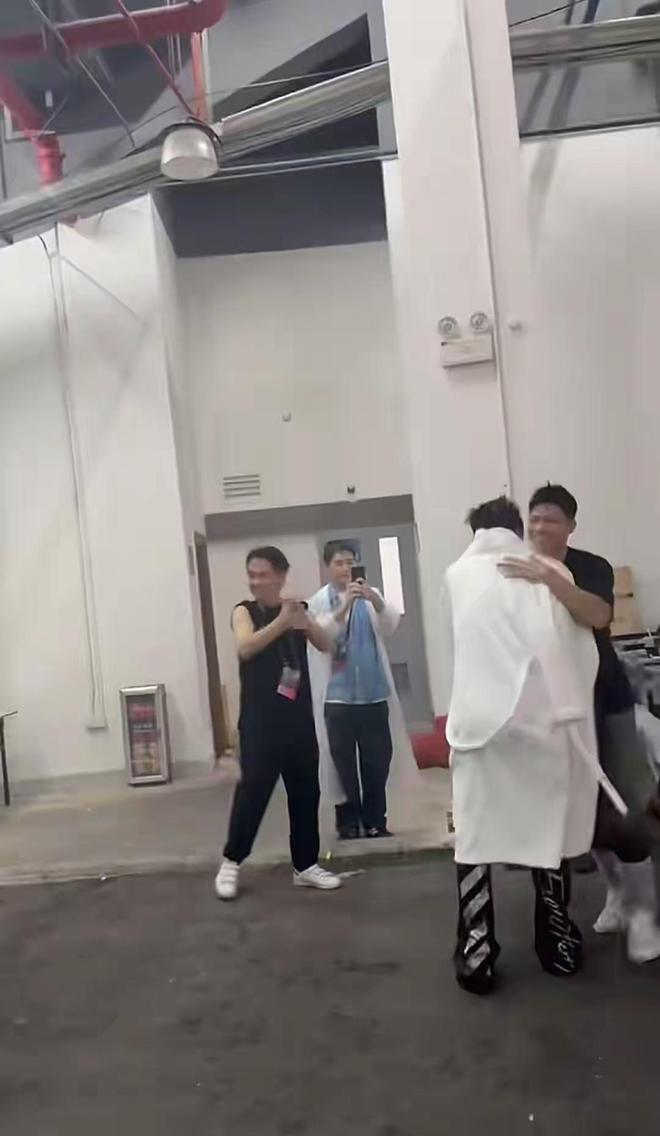 演出结束后,谢霆锋披着厚外套走到场馆门口,意外见到了苏炳添。不同于杭州演唱会时狄波拉、两个儿子等家人及众多大咖现身助阵,此次广州演唱会除英皇老板杨受成等人外,鲜有圈内大咖露面,苏炳添的出现让谢霆锋眼前一亮。已退役的苏炳添如今任职于暨南大学体育学院,身兼体育部主任、党委副书记等职,还是教授与硕士研究生导师。此次他不仅冒雨来看演唱会,还带着妻子林艳芳来到后台。