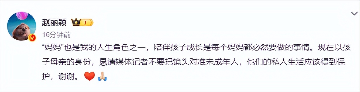 近日,有八卦媒体拍到赵丽颖带儿子想想逛街,引发热议。19日,赵丽颖发文回应此事,希望不要把镜头对准未成年人!她表示:“‘妈妈’也是我的人生角色之一,陪伴孩子成长是每个妈妈都必然要做的事情。现在以孩子母亲的身份,恳请媒体记者不要把镜头对准未成年人,他们的私人生活应该得到保护,谢谢。”